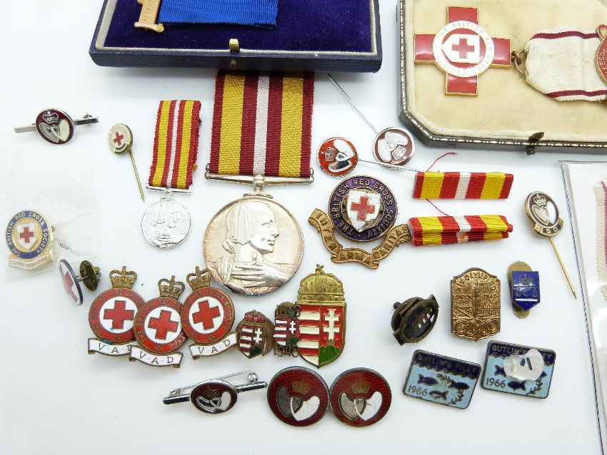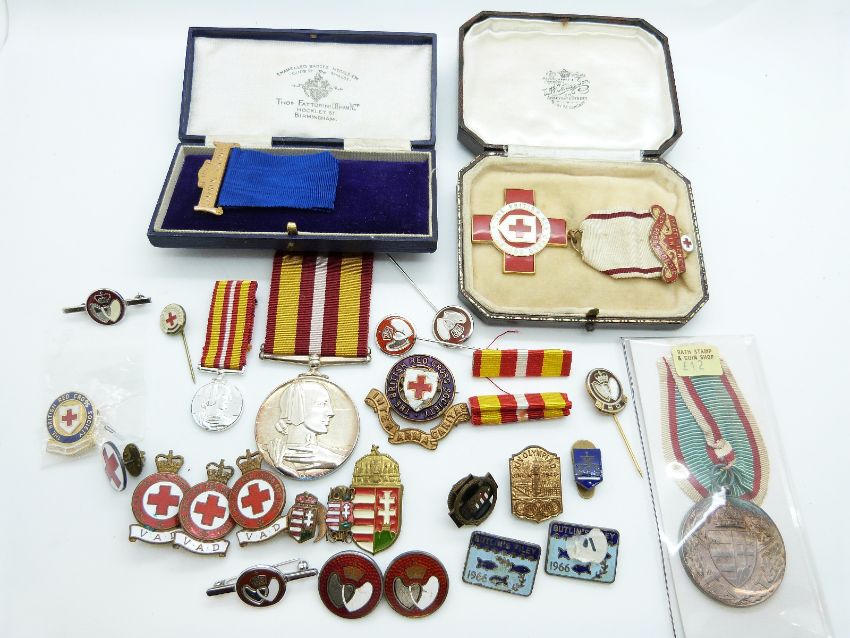 A collection of enamelled Red Cross badges, hallmarked and enamel Blood Donor badge together with a Voluntary Medical Service medal named to W Lawson for long and efficient service, a proficiency medal to 16886 A S Brown and a 1914-18 Austro Hungarian medal