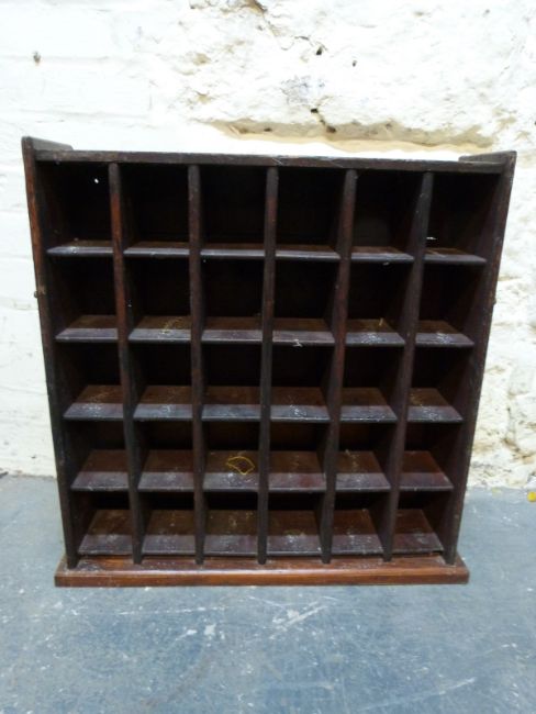 A 19thC mahogany pigeon hole unit with campaign style handles W65 x D19 x H69cm