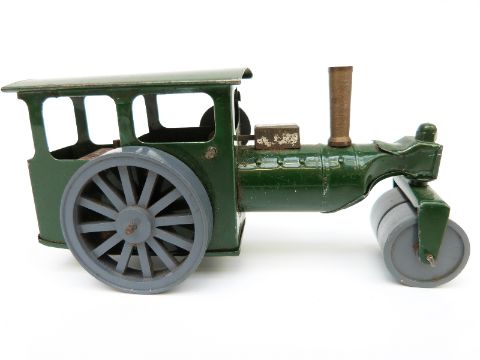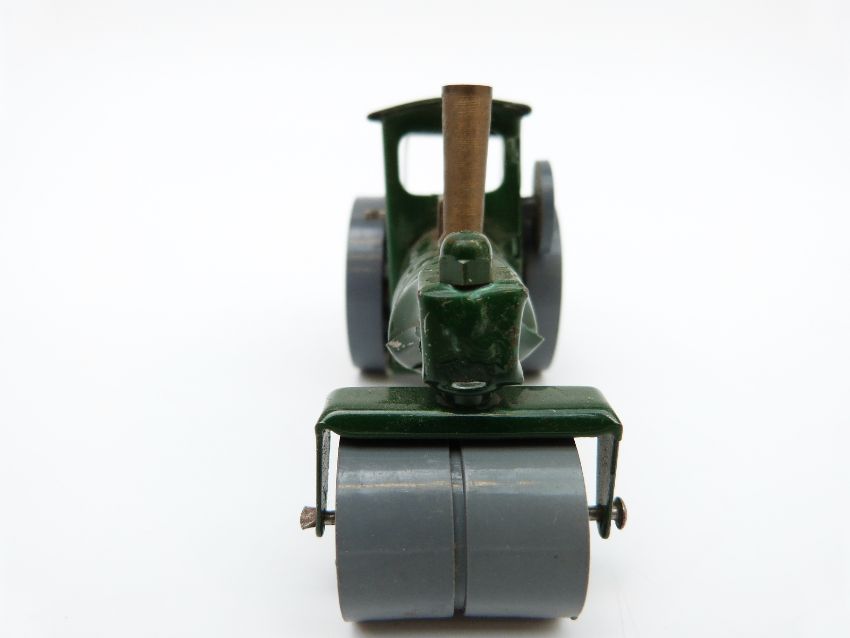 Tri-ang Minic clockwork tinplate Steam Roller with green body, grey wheels and original key