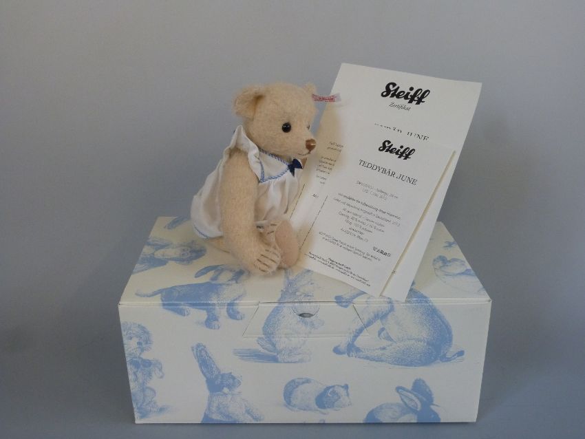 Steiff Teddy Bear June with beige mohair, nautical dress and jointed limbs, limited edition 151/1000, 24cm tall, with box and certificate of authenticity