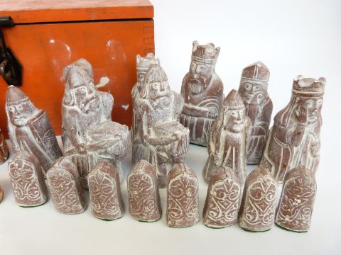 A Lewis Chessmen chess set in wooden box, height of king 8.8cm.