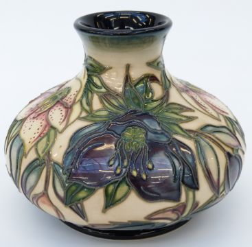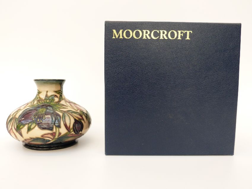 Moorcroft vase of squat form in Hellebore pattern, 10cm tall, in original box