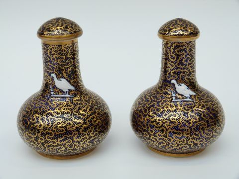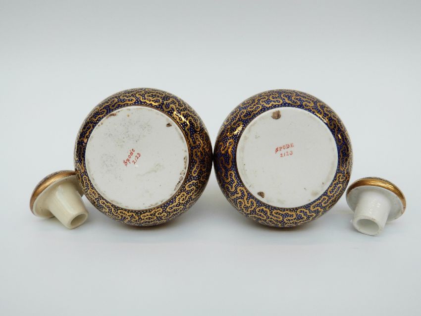 A pair of early 19thC Spode covered enamelled vases with hand decoration of an armorial/crest of a bird to each and Spode 2123 to base, 12cm tall
