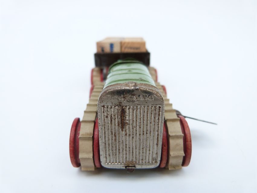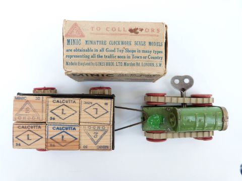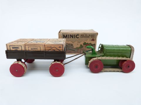 Tri-ang Minic clockwork tinplate Tractor and Trailer with green body, red hubs, cream tracks, brown trailer, wooden blocks and original key, in original box