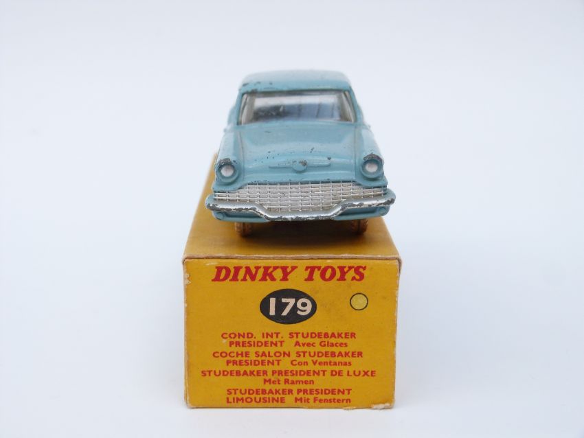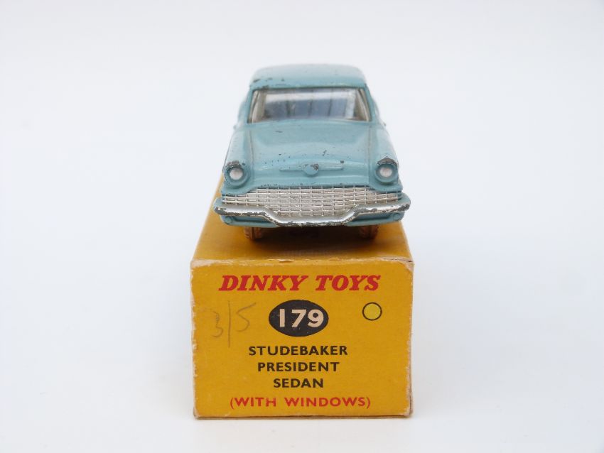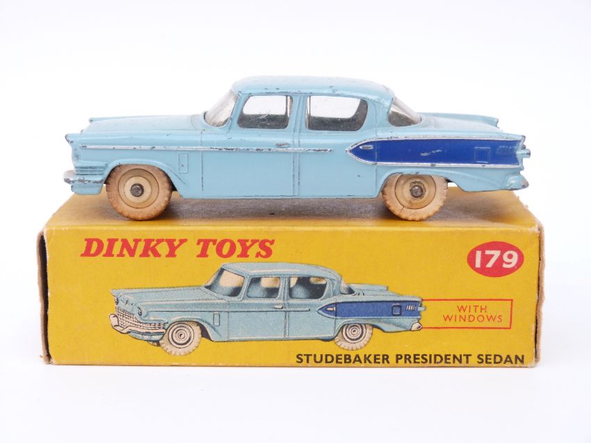 Dinky Toys diecast model Studebaker President Sedan with light blue body, dark blue flash, fawn hubs and white tyres 179, in original box.
