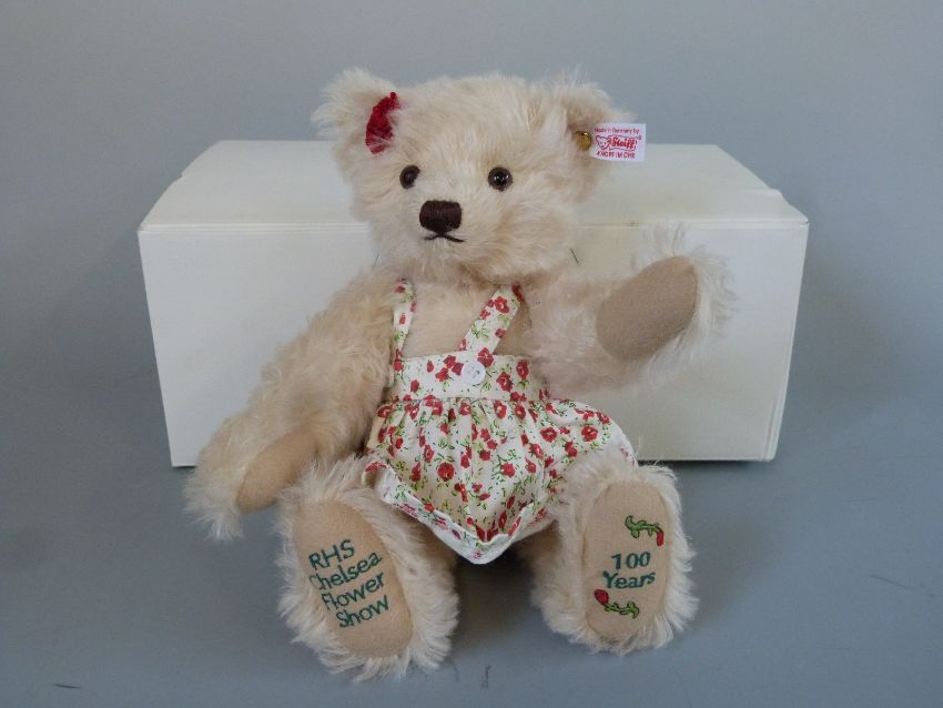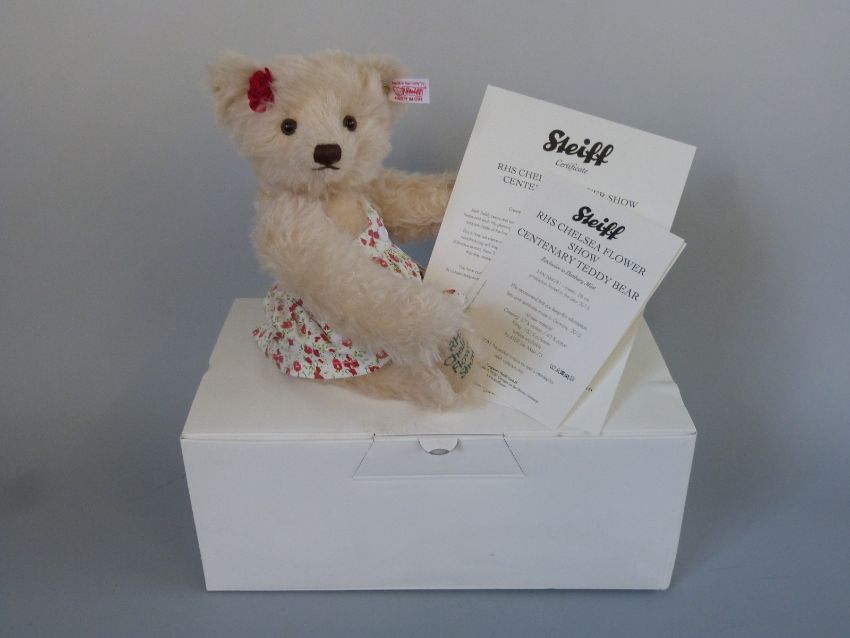 Steiff Teddy Bear RHS Chelsea Flower Show Centenary with cream mohair, rose, floral dress, embroidered pads and jointed limbs, 2013 limited edition 481, 28cm tall, with box and certificate of authenticity