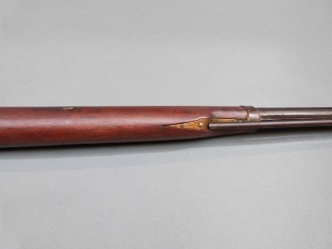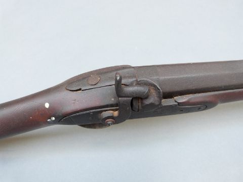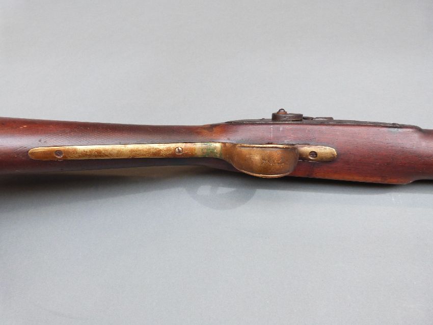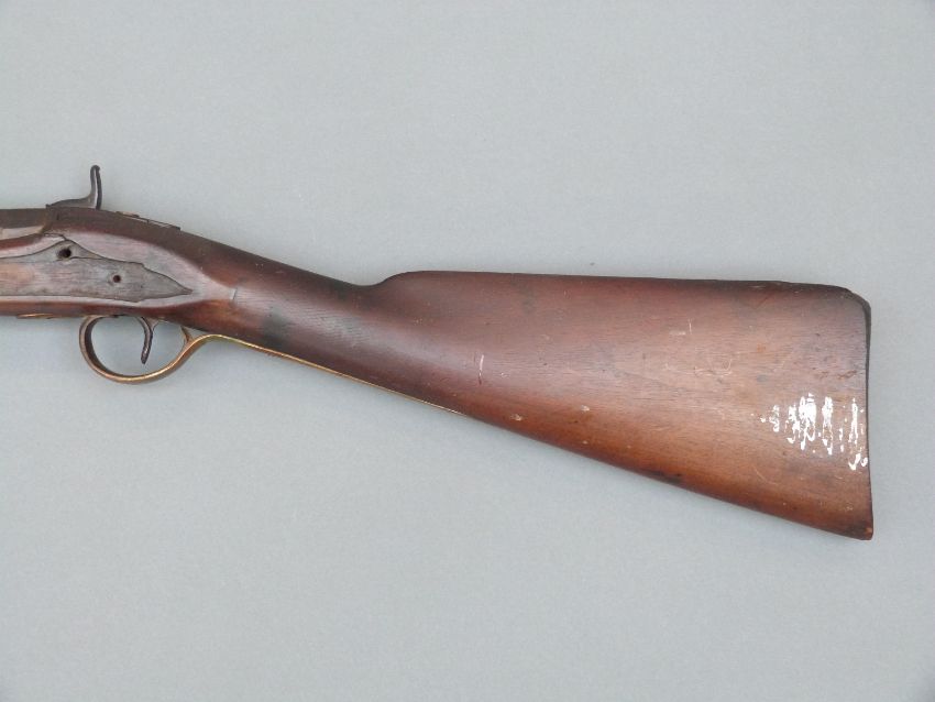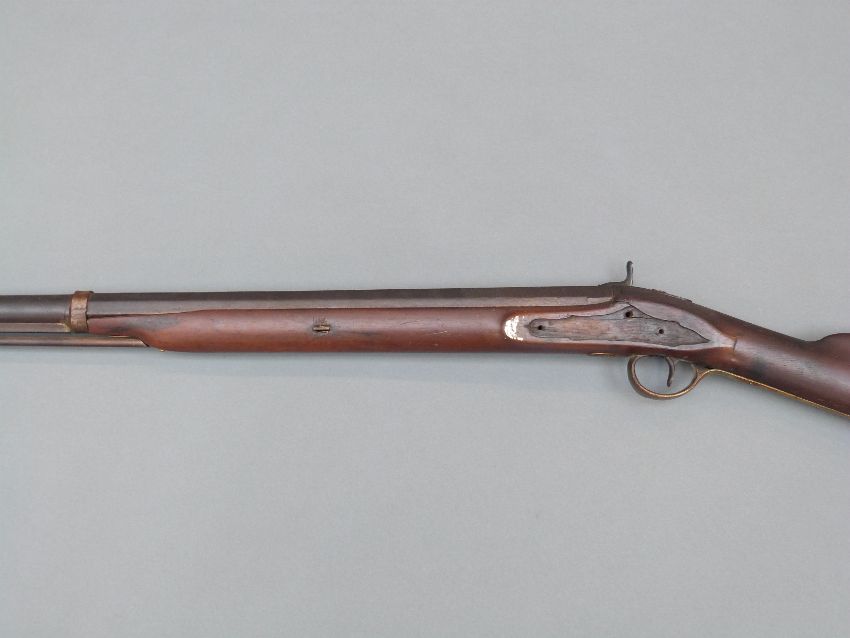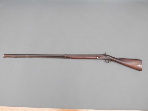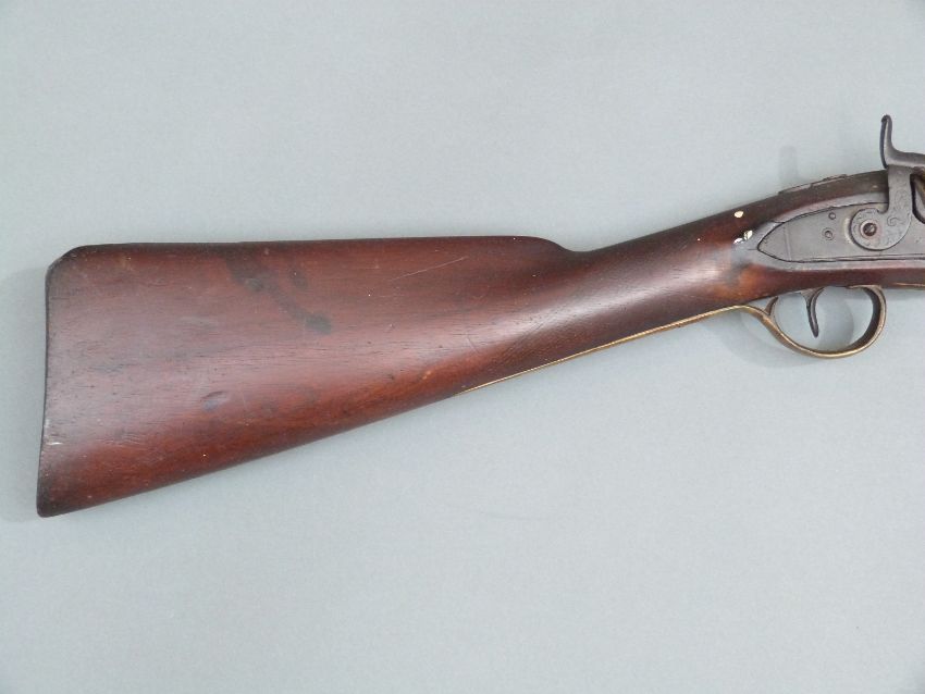 Percussion hammer action gun with indistinctly named, possibly Harris, and engraved lock, chequered grip, brass trigger guard, steel ram-rod and 45.5inch barrel, overall length 157.5cm