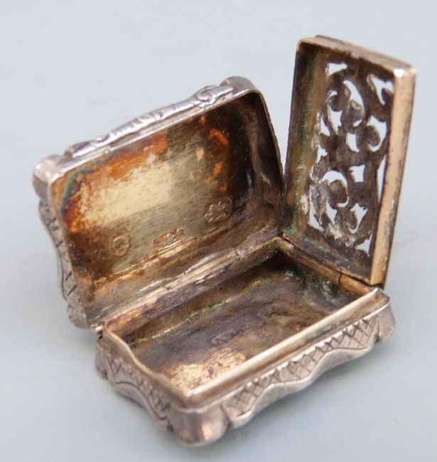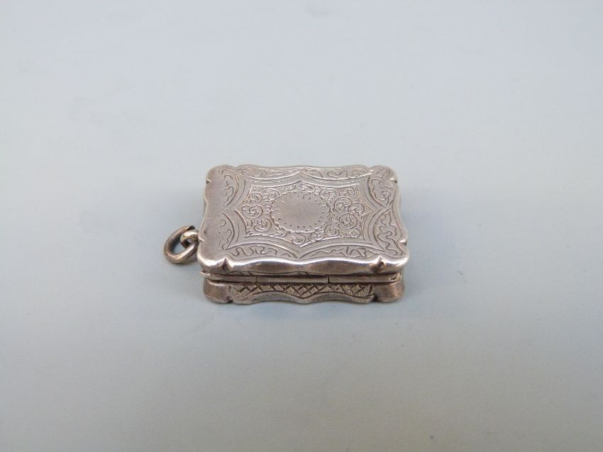 Victorian hallmarked silver vinaigrette with engraved decoration and gilt and pierced interior, Birmingham 1858, maker Aston & Son, length 27mm, 7g