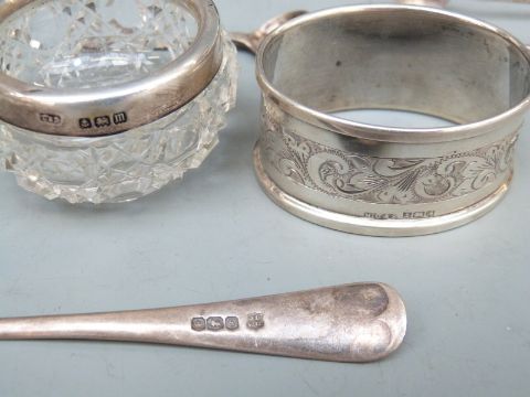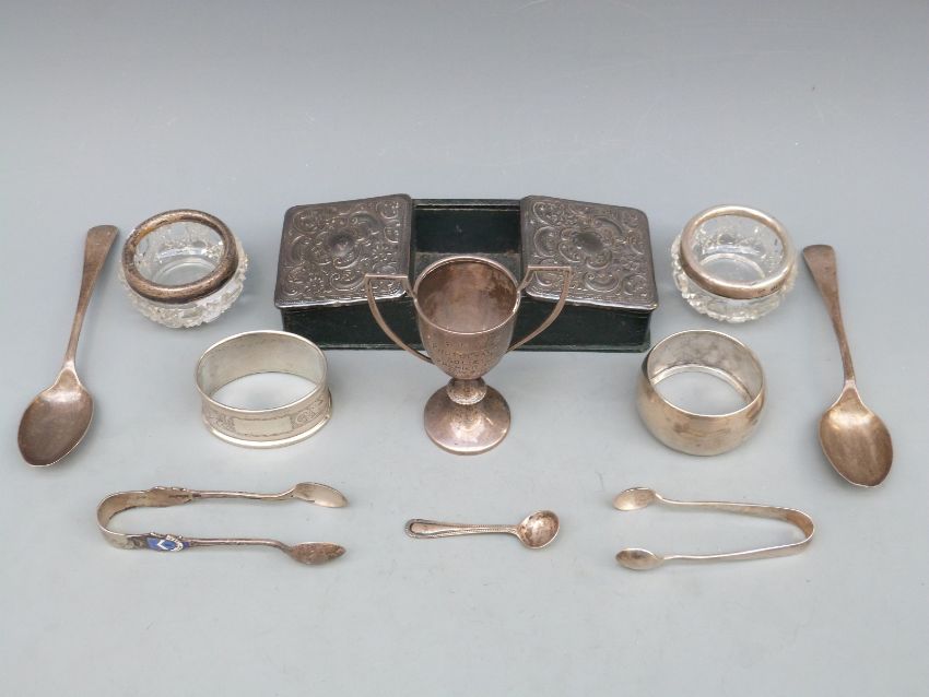 A quantity of hallmarked silver items including leather and embossed hallmarked silver double ended desk tidy, Birmingham 1906 maker Green & Cadbury Ltd, length 15cm, hallmarked silver trophy cup, two napkin rings, two pairs of sugar tongs, two teaspoons and a metal spoon and a pair of hallmarked silver mounted cut class open salts, weight of silver 122g