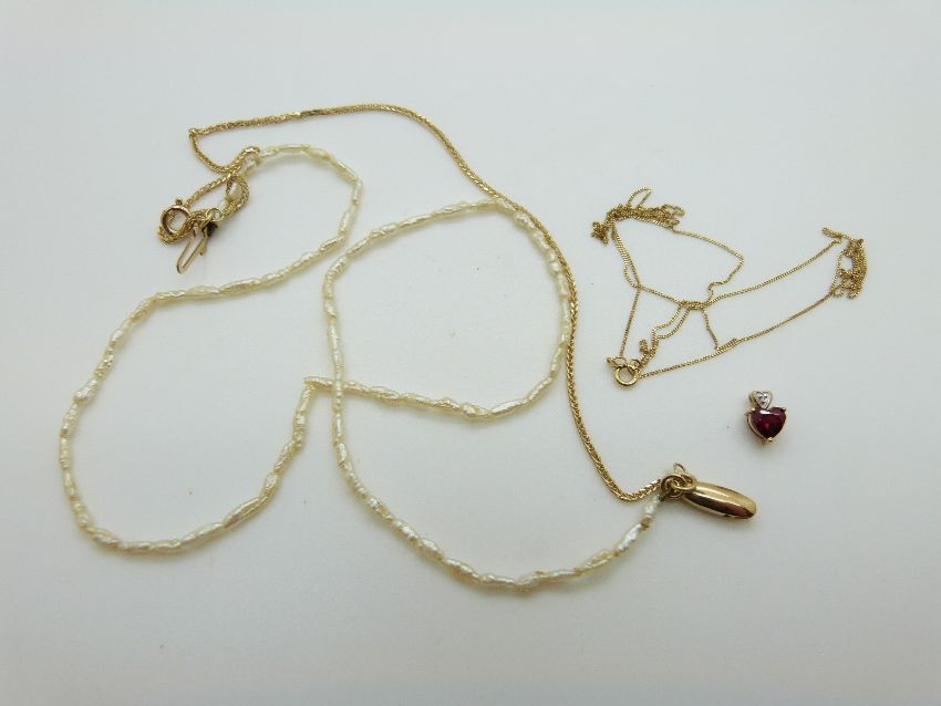 A 9ct gold pendant set with a garnet and diamond and a pearl and 9ct gold necklace