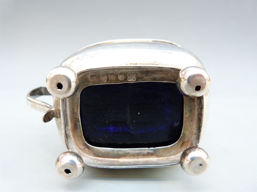 Georgian hallmarked silver mustard with blue glass liner, raised on four ball feet, London 1808, maker Rebecca Emes & Edward Barnard, 10.5cm long, 125g (without liner)