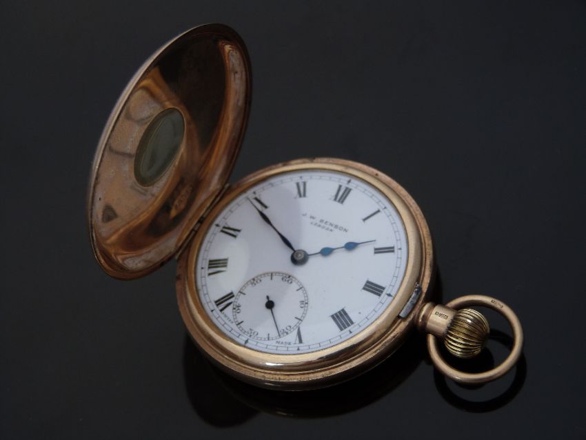 J W Benson 9ct gold half hunter keyless winding pocket watch with inset subsidiary seconds dial, blued hands, Roman numerals, white enamel face, inlaid blue enamel Roman numerals to the case and signed 15 jewel movement, case diameter 46mm, 65.5g, serial number 579349.