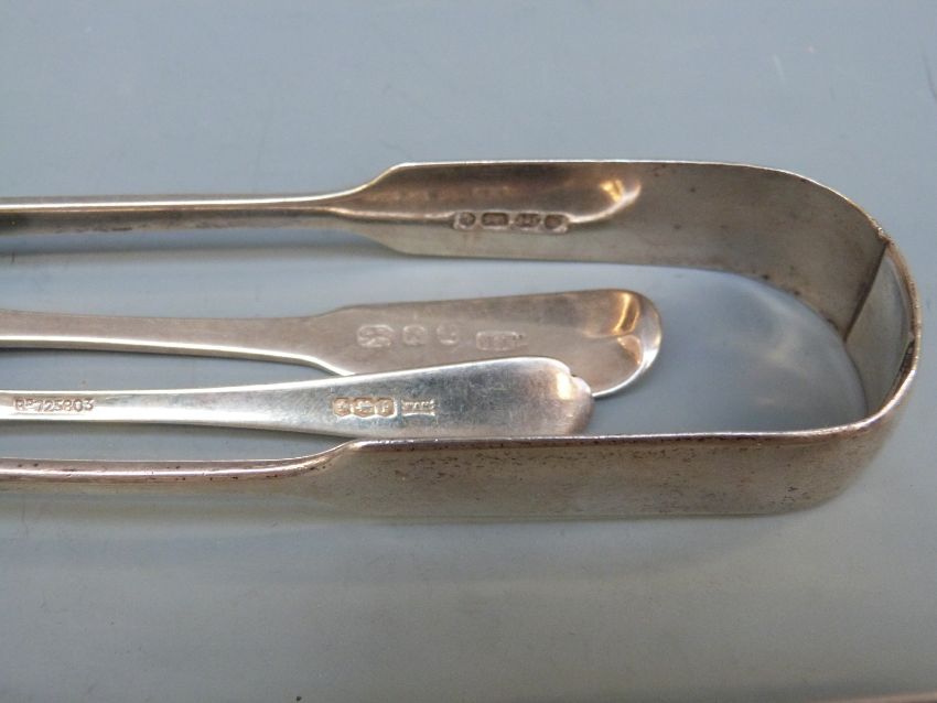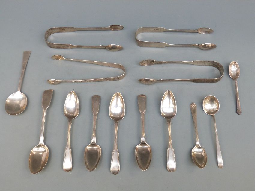 Three sets of Georgian and later hallmarked silver sugar tongs, further pair marked sterling silver and Georgian and later spoons including set of five fiddle and thread pattern examples, 332g