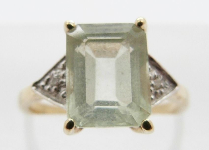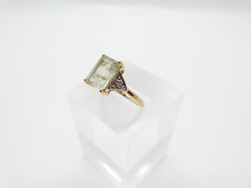A 9ct gold ring with green topaz and two small diamonds either side, size K, 2.3g