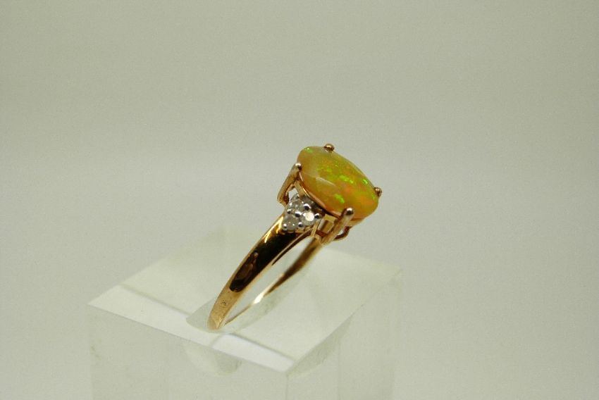 A 9ct gold ring set with yellow opal and diamonds, size N, 1.8g.