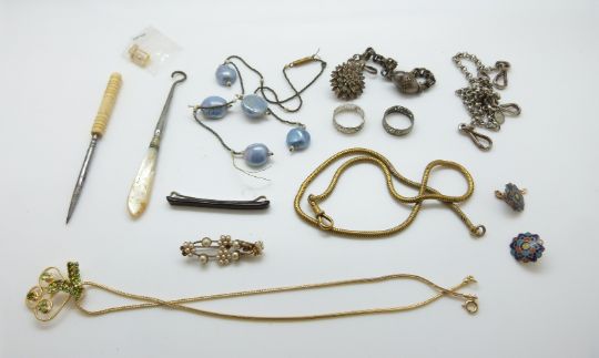 A silver bracelet with egg pendant, fob chain, buckle, enamel buttons, filigree rings etc