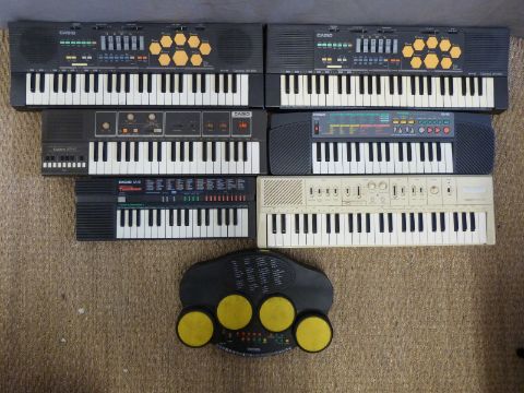 A collection of various Casio electronic keyboards to include Casiotone MT520, MT60 etc., and a Bontempi drum machine
