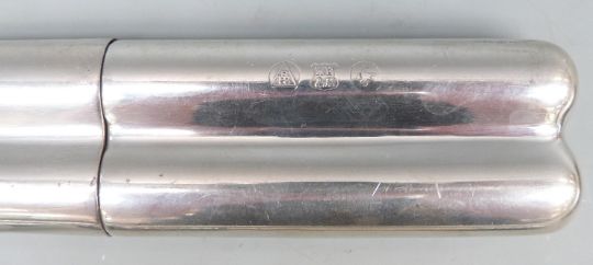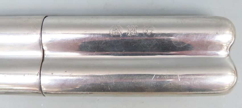 A Swedish white metal cigarette case marked 830, weight 99g, a hallmarked silver and ivory-handled magnifying glass and a plated cigar holder/hip flask
