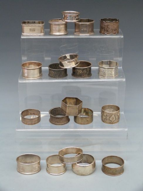 Nineteen Victorian and later hallmarked silver napkin rings, 321g and an Indian, or similar, white metal example 30g