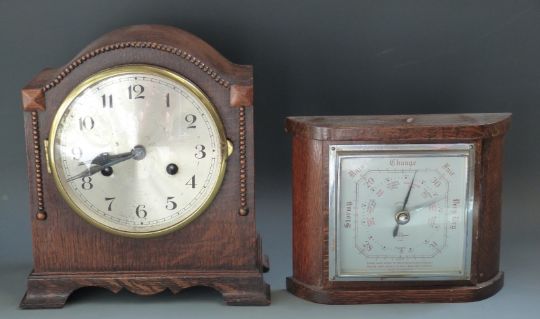 A c1930 oak cased mantel clock with Arabic numerals, the two train movement striking on a gong, the case with beaded decoration, together with a similar era English aneroid barometer in oak case