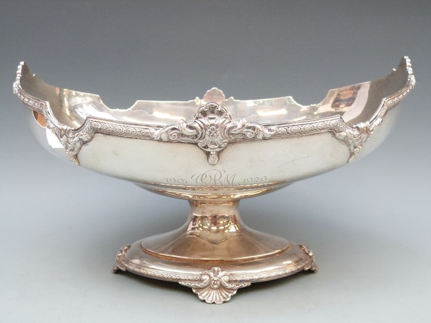 Mappin and Webb George V hallmarked silver pedestal oval bowl with decorative shaped border, London 1924, length 31cm, 1098g