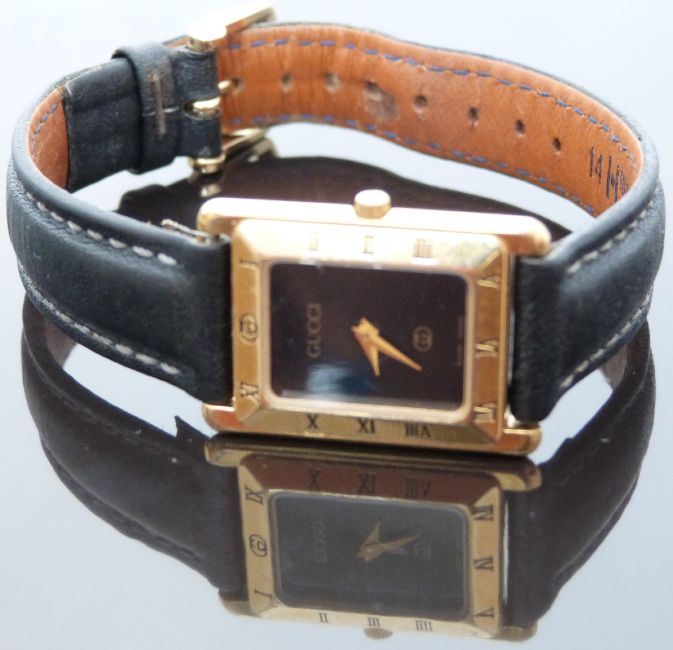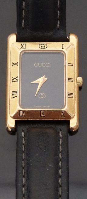 Gucci 4200 FL wristwatch with gold hands, black face, Roman numerals to the bezel, gold plated case and quartz movement, on black leather strap, case diameter 20mm, serial number 032-176.