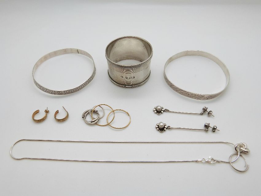 Two silver bangles, silver napkin ring, silver earrings and necklace, 9ct gold earrings etc