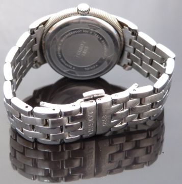Tissot Ballade III gentleman's wristwatch ref. T031410A with date aperture, Roman numerals, skeleton hands, pearl face, stainless steel case and quartz movement, on stainless steel bracelet, case diameter 39mm, serial number RKM-BC-24907M.