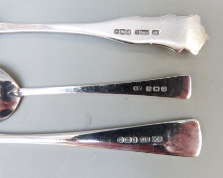 Three sets of five hallmarked silver teaspoons, set of tongs to match one set and a 19thC hallmarked silver mustard or salt spoon, 211g