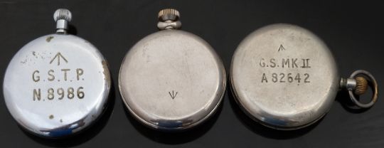 Three military keyless winding pocket watches comprising Leonidas with marked 'G.S.T.P. N.8986' below ministry broad arrow, Ingersoll Leader marked with ministry broad arrow and one other marked 'G.S. MK .II A82642' below ministry broad arrow, case diameters 52mm.