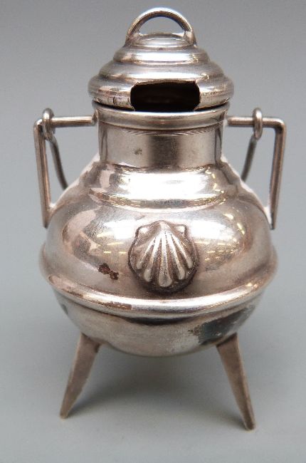 A novelty white metal lidded cauldron with swing handle, raised on three legs, marked with star and shell to underside, height 85mm, 23g