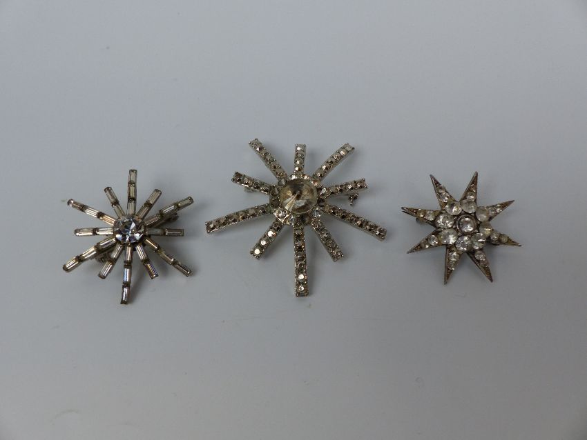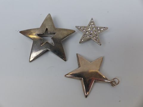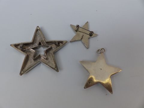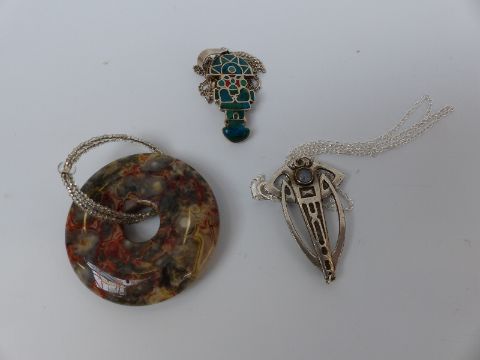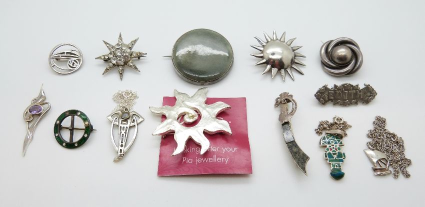 A silver and paste star brooch, silver chains, silver and agate sword brooch, silver sun brooch, Kensington pottery brooch, Victorian white metal knot brooch, Charles Horner enamel brooch, Arts & Crafts pendant with a drop pearl etc