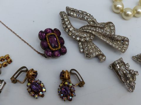 A collection of costume jewellery to include diamante necklace, Victorian paste jewellery, a white metal brooch set with a cameo, brooches, a Victorian brooch set with amethyst etc