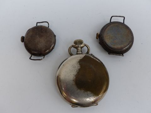 A silver ladies wristwatch with blue guioche enamel bezel together with another similar watch with pinted enamel dial and a pocket watch with visible escapement.
