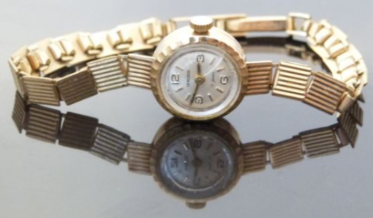 Sekonda 9ct gold ladies wristwatch with two-tone gold hands, Arabic numerals baton markers, silver face and 17 jewel calibre 160/A movement in gold plated case on gold plated bracelet, case diameter 17mm.