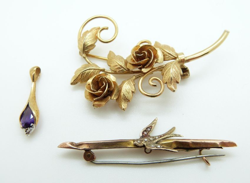 A silver gilt brooch in the form of flowers by Bond Boyd, 9ct gold swallow brooch and a 9ct gold pendant set with an amethyst and a diamond