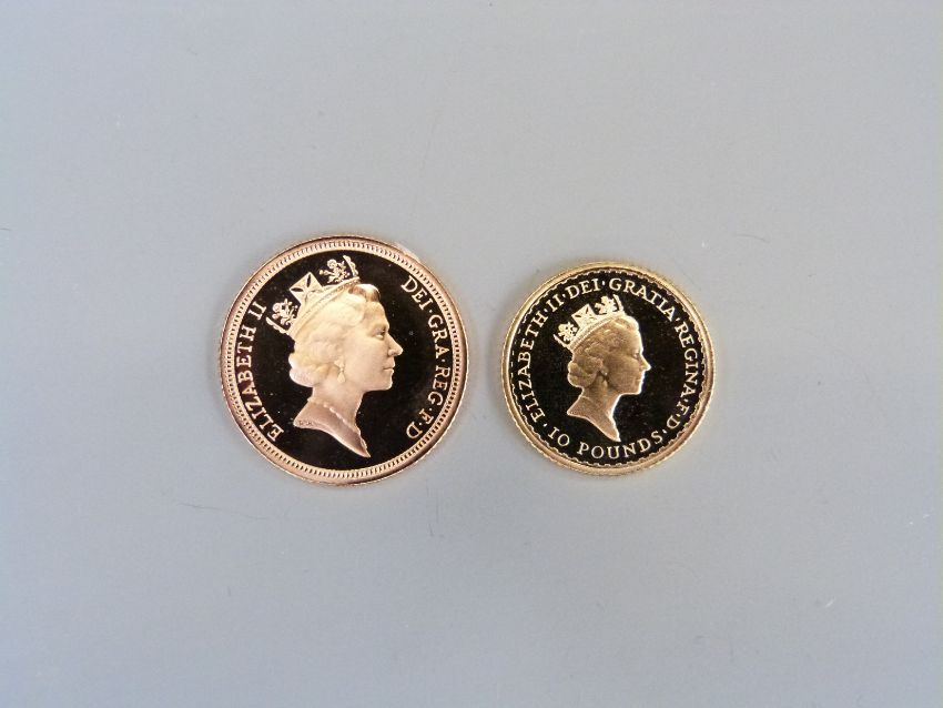 1995 cased gold proof half sovereign and a gold proof 'miniature' £10 Britainnia no's 4380 and 1283