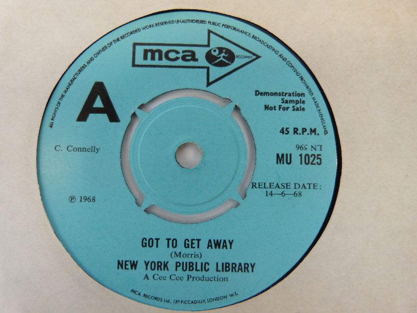 Two singles by New York Public Library, Got To Get Away MCA demo (MU1025) EX and I Ain't Gonna Eat Out My Heart Anymore, Columbia (DB7948) VG