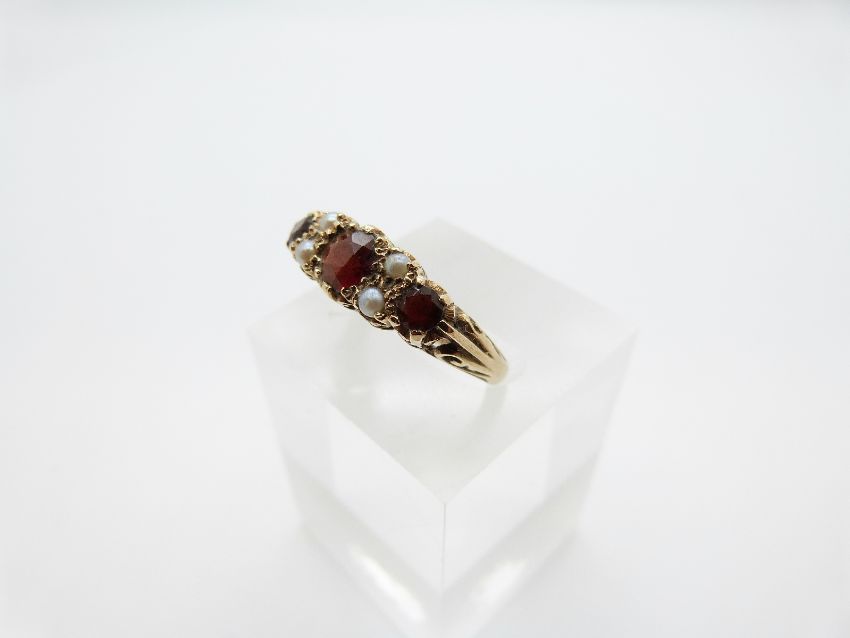 A 9ct gold ring set with garnets and pearls, size P, 3.5g