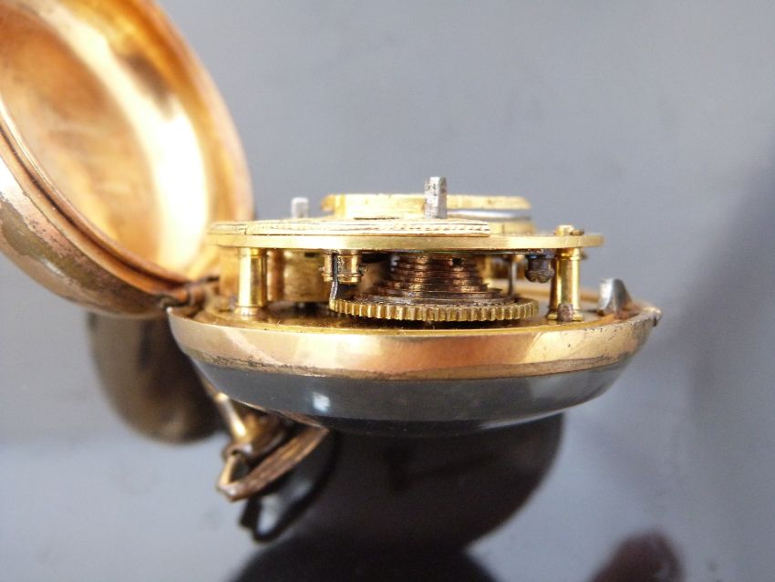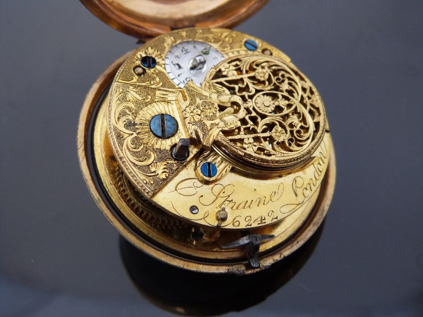 C Straine of London pair cased pocket watch with painted tortoiseshell case featuring a scene of a lady with a butterfly, Arabic numerals, white enamel dial, gilt metal inner case, ornately engraved signed fusee movement and masked balance cock, case diameter 53mm, serial number 6242.