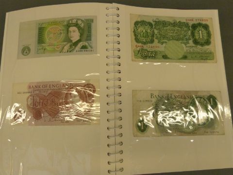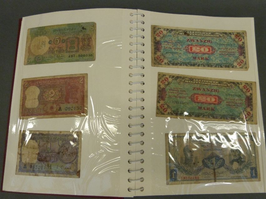 Over 60 used world bank notes and postal orders etc to include UK, China, USA, Germany, Jamaica etc, in a collector's album