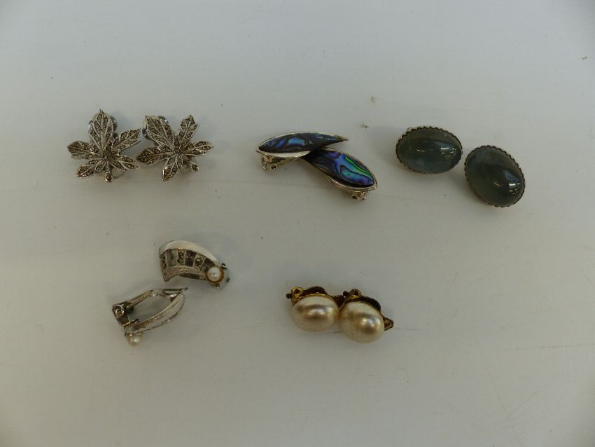 A collection of jewellery including hallmarked silver brooch set with green & blue enamel, Victorian silver brooch, silver and marcasite brooch, 9ct back and front locket, mother of pearl counter, paste necklaces etc