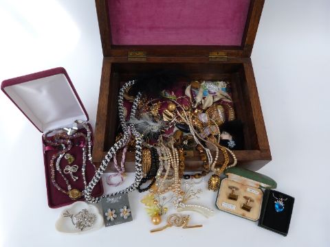 A collection of costume jewellery including tigers eye necklace, tiger's eye cufflinks, Art Deco necklace, hat pin, silver and tiger's eye carved cufflinks and silver ring, all in a wooden box