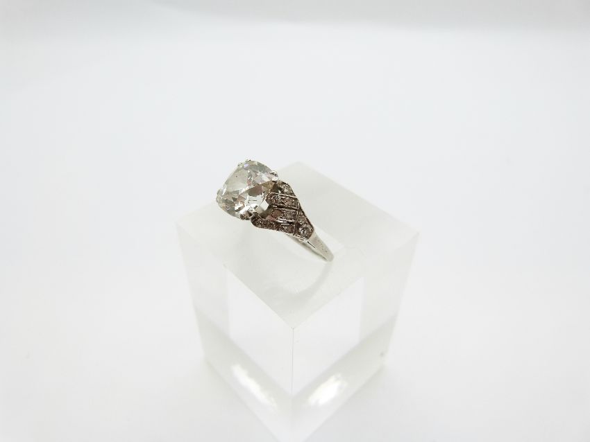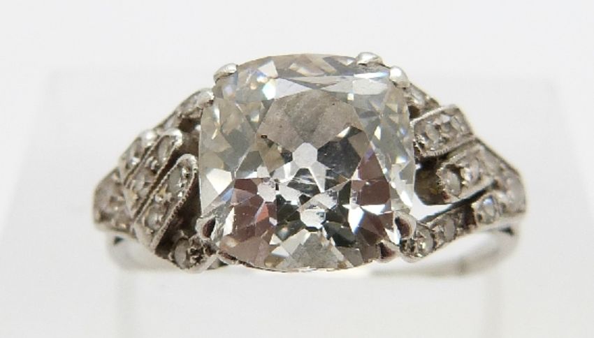 An Art Deco platinum ring set with a cushion cut diamond of approximately 2.78ct, flanked by diamond encrusted shoulders