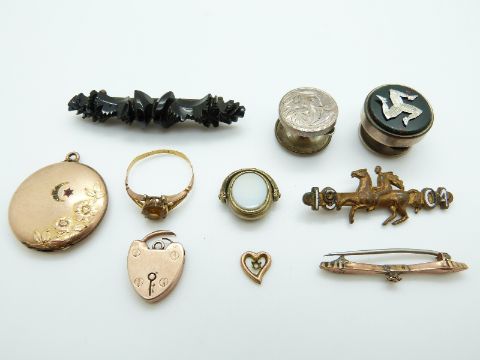 A 9ct gold heart padlock (2.5g), carved jet brooch, 9ct brooch, Victorian silver button, gold plated locket, 22ct gold ring set with a citrine (1.3g) etc