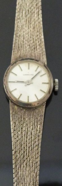 Garrard hallmarked silver ladies wristwatch with two-tone hands and baton markers, silver face and 17 jewel ETA calibre 241 movement on integral textured hallmarked silver bracelet, case diameter 18mm.