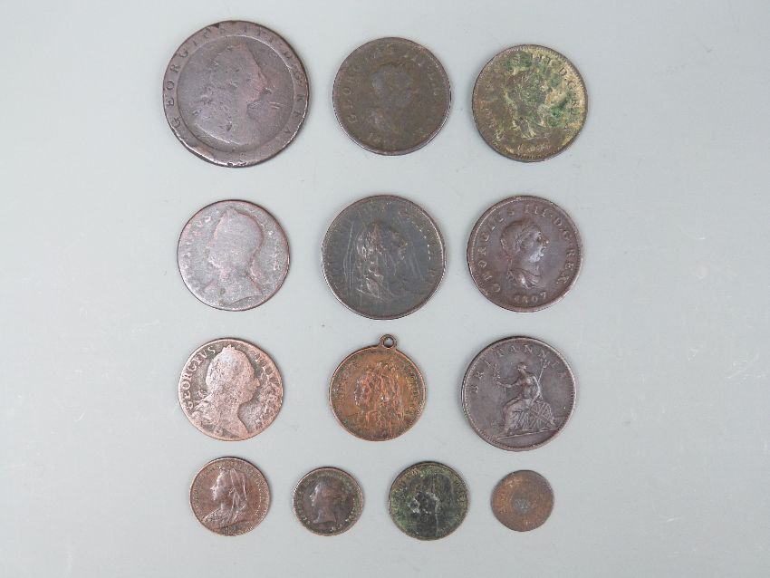 A small collection of Georgian coinage including Hibernia, various grades poor to very fine together with a few Victorian examples including an 1844 half farthing and a small unidentified hammered coin, possibly a medieval jeton