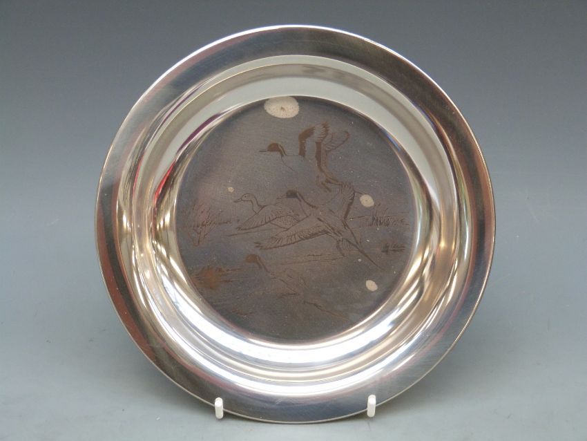 Peter Scott hallmarked silver limited edition 1972 Christmas plate by John Pinches, diameter 20.5cm, 186g, in original box with certificate