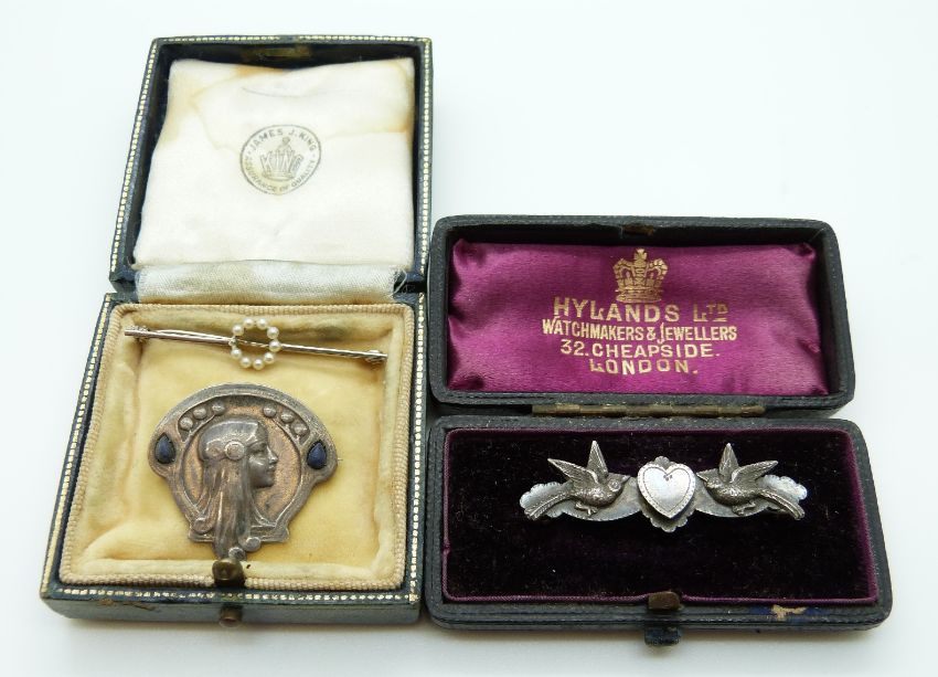 An Art Nouveau brooch by Geschuzt in the form of a young lady, together with a 9ct white gold brooch and a hallmarked silver brooch in the form of two birds in original box