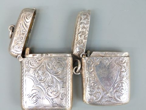 Two Edward VII hallmarked silver vesta cases with engraved decoration, one Birmingham 1909, maker's mark CS, 41mm tall, 17g, the other Birmingham 1905, maker Thomas James Spetton, 50mm tall, 29g